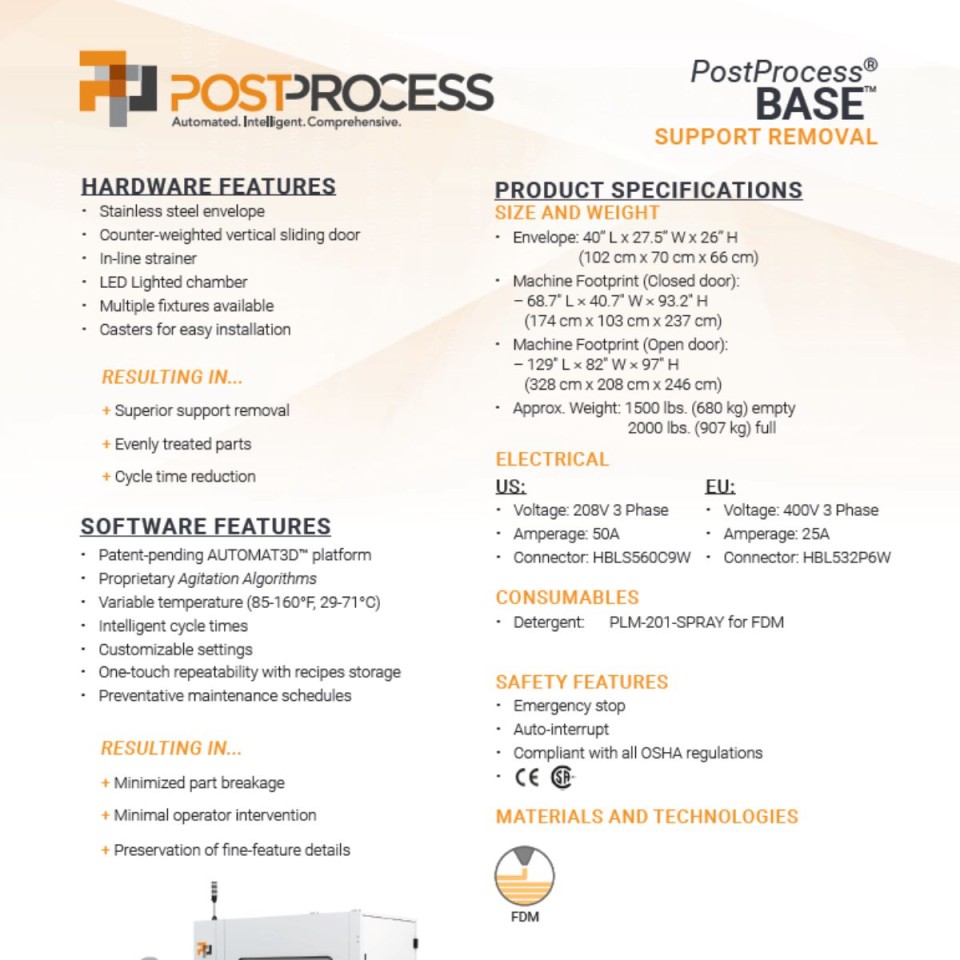 The BASE™ enables consistent, hands-free support removal for 3D printed parts by combining PostProcess's patented AUTOMAT3D® software program with precisely controlled energy and exclusive additive designed detergents. Intelligent cycle time programming, adjustable settings, one-touch repeatability with recipe storage, and pre-programmed preventative maintenance routines all help to speed up your operations.