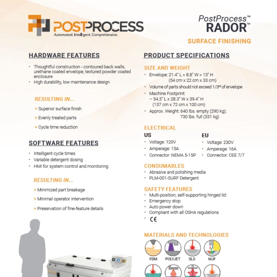 The PostProcess® RADOR™ is an automated intelligent surface finishing machine for all 3D print technologies fo both plastics and metals. Print technologies include SLS, FDM, SLA, Polyjet, CLIP, MJF, DLP, DMLS, SLM, DED and many more. Designed solely for additive manufacturing the RADOR™ enables hands-free surface finishing with consistency and repeatability even for unique and delicate geometries.
