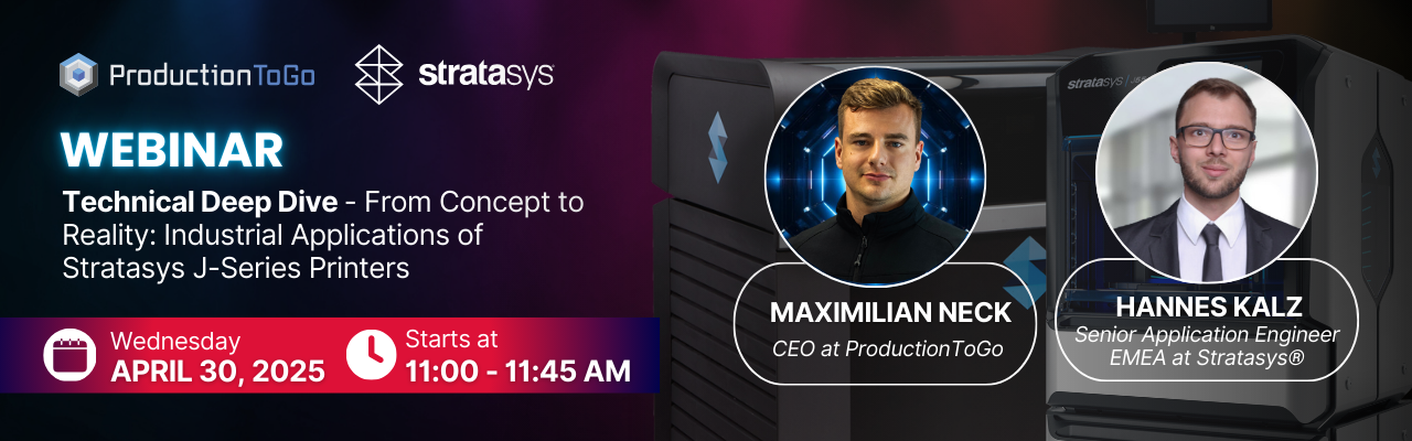 Join us for an in-depth exploration of how the Stratasys J55™ and J850™ printers are revolutionizing prototyping and production across multiple industries. This highly technical session will be led by Maximilian Neck - CEO of ProductionToGo, and Hannes Kalz - Senior Application Engineer EMEA at Stratasys®. Together they will share expert knowledge about the groundbreaking capabilities of these PolyJet™ 3D printers.