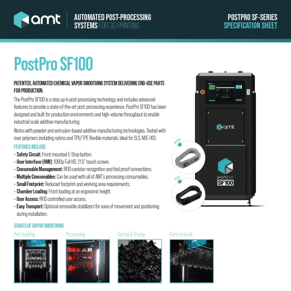 Der PostPro SF100 PURE ist eine hochmoderne Dampfglättungsanlage, die von AMT für die Hochleistungsnachbearbeitung von 3D-gedruckten Komponenten entwickelt wurde. Mit einer Verarbeitungskammer von 100 Litern ist diese Maschine für die Nachbearbeitung großer Stückzahlen ausgelegt und damit perfekt für die industrielle Fertigung geeignet. Sie nutzt die einzigartige Dampfglättungstechnologie von AMT, die sowohl die Außen- als auch die Innenflächen glättet und versiegelt, um den Produkten ein spritzgussähnliches Oberflächenfinish zu verleihen.