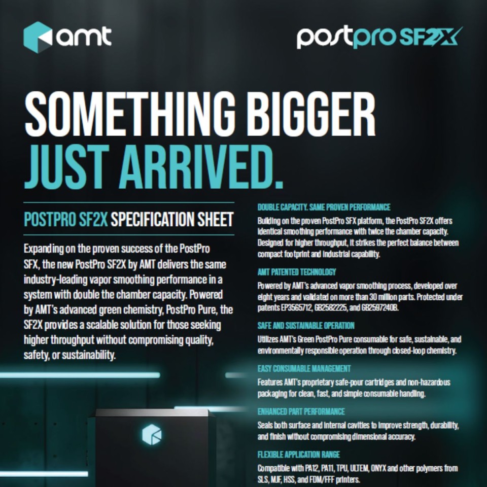 Der PostPro SF2X baut auf dem weltweiten Erfolg der PostPro-SFX-Serie von AMT auf und liefert chemisches Glätten der nächsten Generation mit doppeltem Kammervolumen, um den Anforderungen der industriellen additiven Fertigung im großen Maßstab gerecht zu werden. Das System bietet präzise Oberflächenveredelung und Abdichtung von Innenhohlräumen für Bauteile aus PA11, PA12, TPU und PP, die mit Technologien wie MJF, SLS, HSS sowie ausgewählten FDM-Materialien gefertigt wurden.
