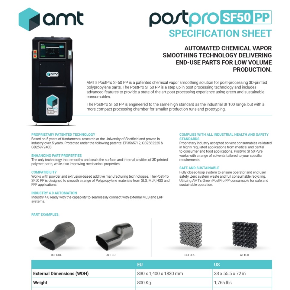 Der PostPro SF50 PP verwendet die einzigartige Dampfglättungstechnologie von AMT, die die Oberflächenqualität von 3D-gedruckten Komponenten massiv verbessert. Diese firmeneigene Technologie nutzt einen Non-Line-of-Sight-Ansatz, um komplexe Geometrien und innere Hohlräume erfolgreich zu glätten und gleichzeitig die mechanischen Eigenschaften der Teile zu erhalten. Diese Fähigkeit macht ihn besonders nützlich für Anwendungen in Branchen, die eine hochwertige Oberflächenbeschaffenheit erfordern, wie z. B. die Automobil- und Konsumgüterindustrie.