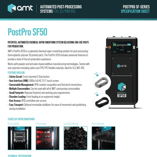 Das System erzeugt keinen Ausschuss und recycelt alle Verbrauchsmaterialien, einschließlich des umweltfreundlichen PostPro Pure Verbrauchsmaterials von AMT. Mit diesem können sowohl die Oberfläche als auch die inneren Hohlräume von 3D-gedruckten Polymerkomponenten geglättet und versiegelt werden, wodurch nicht nur das Erscheinungsbild, sondern gleichzeitig auch die mechanischen Eigenschaften verbessert werden. Der SF50 PURE ist mit einer Vielzahl von Materialien kompatibel, die mit Pulverbettschmelztechnologien (z. B. SLS, MJF, HSS, SAF™) und extrusionsbasierten Druckverfahren (z. B. FFF, FGF, HSE, FDM) hergestellt werden. Der PostPro SF50 PURE verfügt über Industrie 4.0-Automatisierungsfunktionen, die eine einfache Schnittstelle zu externen Manufacturing Execution Systemen (MES) und Enterprise Resource Planning (ERP)-Systemen ermöglichen.