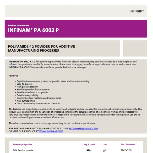 INFINAM PA 6002 P ist ein Hochleistungs-Polyamid-12-Pulver (PA12), das für Pulverbett-Fusions-3D-Drucktechnologien optimiert wurde. Es kombiniert hervorragende mechanische Eigenschaften mit außergewöhnlicher chemischer Beständigkeit und Oberflächenqualität und ist speziell auf den industriellen Einsatz in Branchen wie Automobil, Luft- und Raumfahrt, Medizintechnik sowie lebensmittelkonforme Anwendungen ausgelegt.