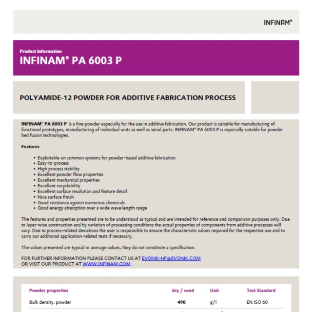 INFINAM PA 6003 P ist ein nachhaltiges, schwarzes PA12-Pulver, das für Pulverbett-Fusions-3D-Drucktechnologien entwickelt wurde. Es kombiniert hohe mechanische Festigkeit mit hervorragender chemischer Beständigkeit und Lebensmittelsicherheit und eignet sich für eine Vielzahl industrieller, automobiltechnischer, luft- und raumfahrtbezogener sowie medizinischer Anwendungen.