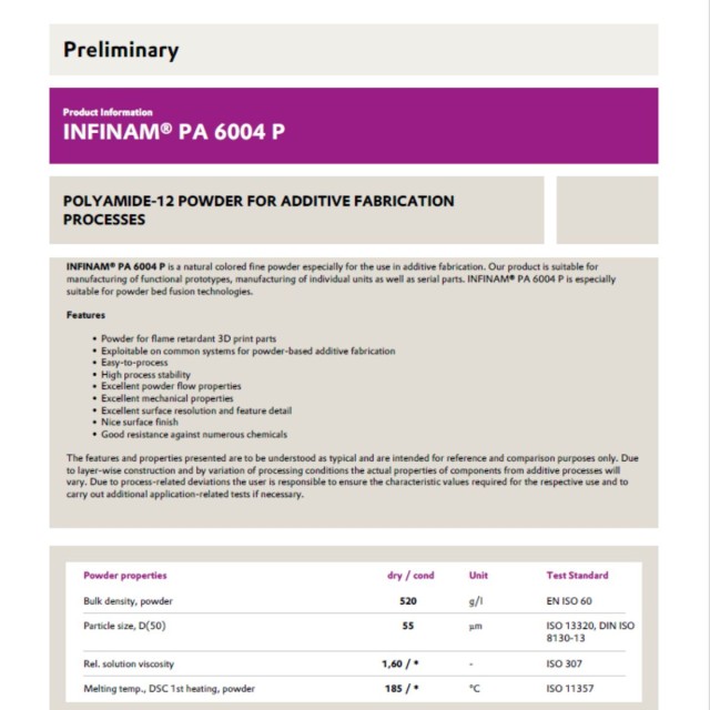 INFINAM® PA 6004 P, ein feines Pulver aus Polyamid 12, hergestellt vom Industriegiganten Evonik, ermöglicht die additive Fertigung von flammhemmenden Komponenten mit allen gängigen pulverbasierten 3D-Drucktechnologien.