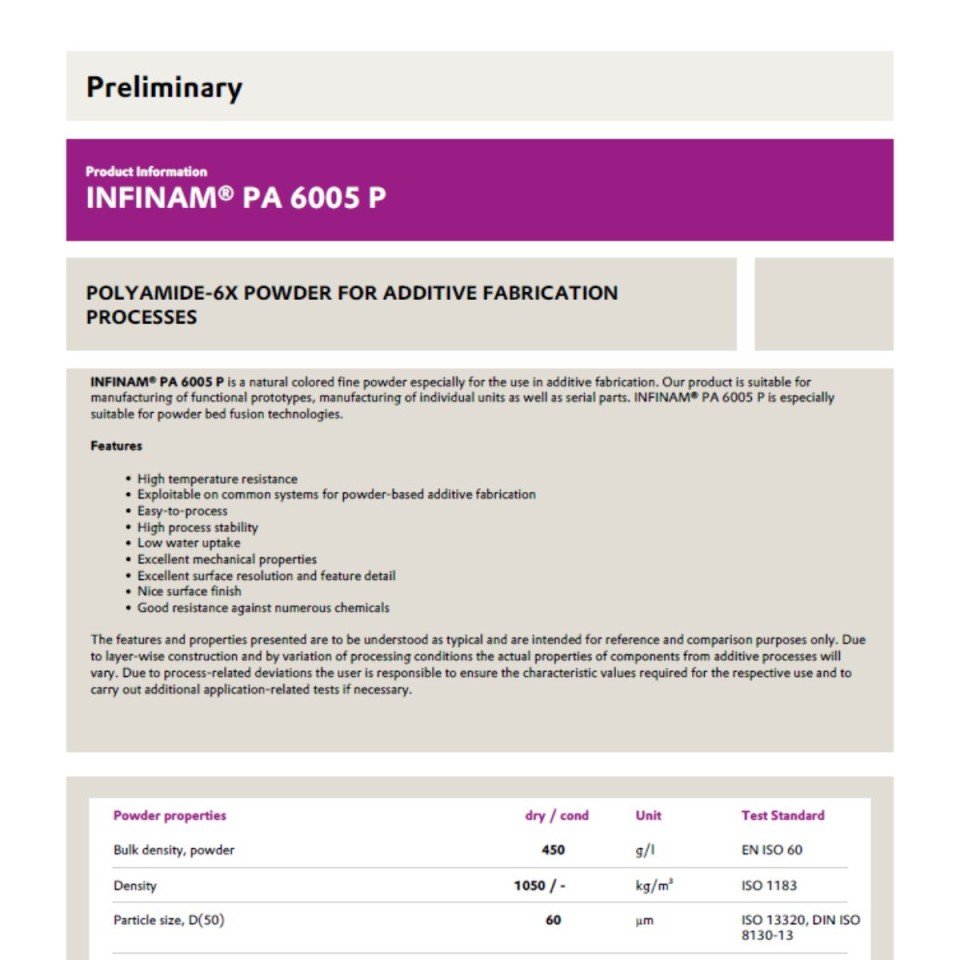 Um Nutzern maximale Auswahl zu ermöglichen, wurde das INFINAM® PA 6005 P darauf ausgelegt, mit allen gängigen pulverbasierten Technologien maximale Qualität zu gewährleisten - om Hochgeschwindigkeitssintern (HSS) über Powder Bed Fusion (PBF) bis hin zum Selektiven Lasersintern (SLS).