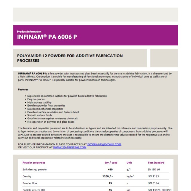 Das INFINAM® PA 6006 P ist ein mit Glaskugeln gefülltes Polyamid 12 vom deutschen Industriegiganten Evonik. Es weist eine überdurchschnittlich hohe Steifigkeit und eine exzellente Detailfeinheit auf.