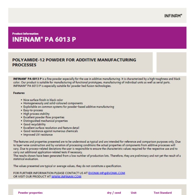 INFINAM PA 6013 P ist ein hochwertiges, mit schwarzem Carbon eingebettetes PA12-Pulver, das für Pulverbett-Fusions-3D-Drucktechnologien wie SLS, HSS und MJF optimiert wurde. Es bietet außergewöhnliche mechanische Festigkeit, chemische Beständigkeit und Haltbarkeit und ist damit das ideale Material für anspruchsvolle industrielle Anwendungen, darunter Luft- und Raumfahrt, Automobilindustrie sowie Außeneinsätze, bei denen UV-Beständigkeit entscheidend ist.