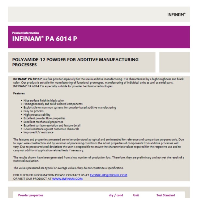 INFINAM PA 6014 P ist ein Hochleistungs-Polyamid-12-Pulver, verstärkt mit Carbon Black und optimiert für Pulverbett-Fusionsverfahren wie SLS, MJF und HSS. Dieses hochwertige schwarze Nylonpulver bietet ausgezeichnete Fließeigenschaften und konstantes Sinterverhalten und ermöglicht die Herstellung langlebiger, chemisch beständiger Bauteile mit hervorragender Oberflächenqualität und echter Pigmentierung.