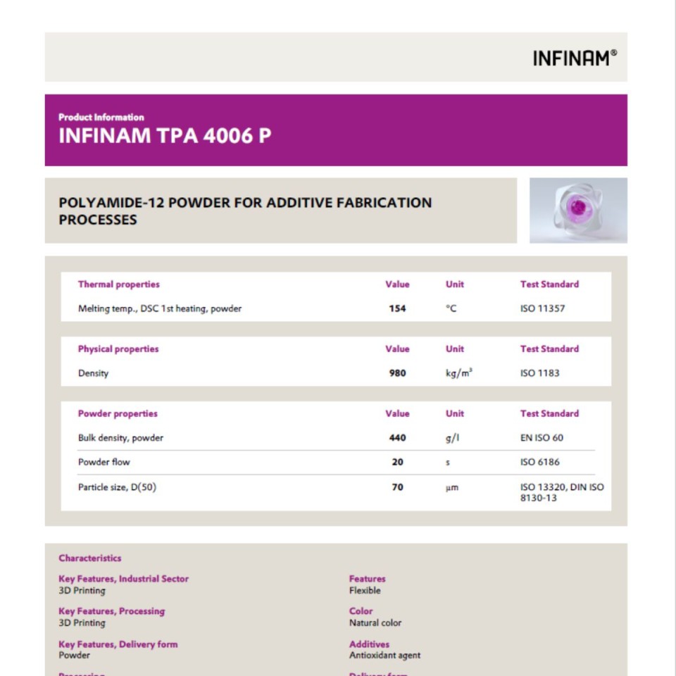 Das INFINAM® TPA 4006 P ist mannigfaltig einsetzbar. Ob für die Produktion eines einzelnen Prototypen oder eines Endverbrauchbauteils in Serienproduktion, mit dem INFINAM® TPA 4006 P wird Ihre Produktion effizienter.