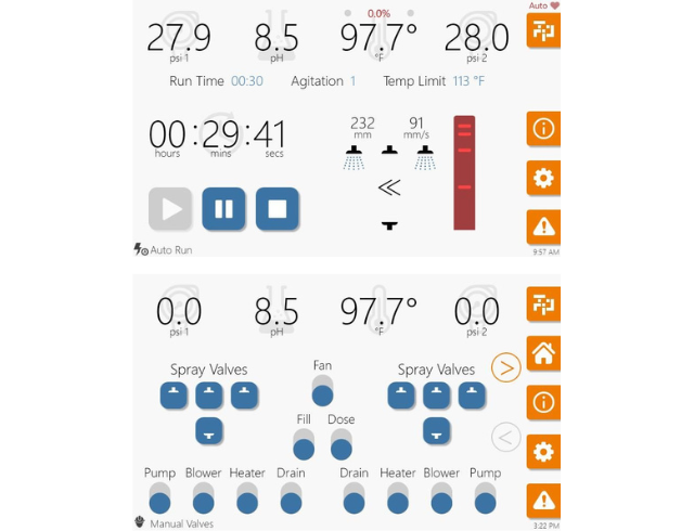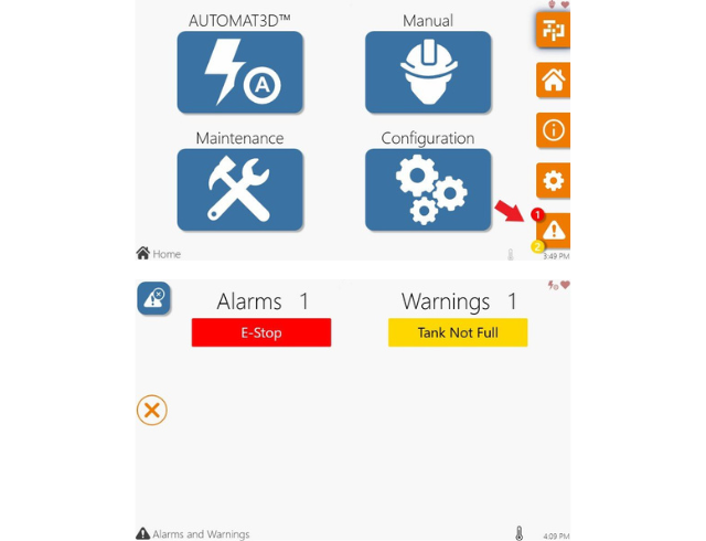Wenn eine Warnbedingung aktiviert wird, macht das System den Bediener so schnell wie möglich auf das Problem aufmerksam. Es ist jedoch nicht zwingend notwendig, den Arbeitszyklus sofort anzuhalten. Allerdings führen Warnungen irgendwann zu Alarmen, die behoben werden müssen, um Schäden an dem BASE™ oder Ihren Teilen zu vermeiden. Der BASE™ verfügt über die Warnungen "Tank nicht voll", "Auto PSI hoch und niedrig", "Niedriger pH-Wert" und "Temperaturgrenzwert überschritten" sowie über die Alarme "Not-Aus", "Wartung fällig", "Dosierfehler", "Bewegungsfehler" und einige weitere.