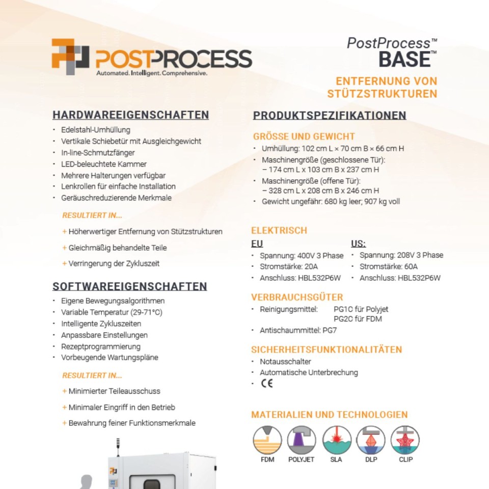 Suchen Sie nach einer skalierbaren Lösung für die Nachbearbeitung großer Mengen von FDM/FFF-Komponenten mit löslichen Trägern? Der PostProcess® BASE™ ist die größte automatisierte Lösung, die speziell für diese Bauteile entwickelt wurde!
