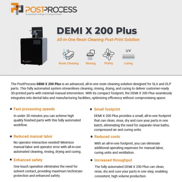 Für SLA- und DLP-Teile ist die PostProcess® DEMI X 200 Plus eine fortschrittliche All-in-One-Resinreinigungslösung. Mit wenig manueller Arbeit beschleunigt dieses vollständig automatisierte System die Resinreinigung, das Spülen, Trocknen und Aushärten, um gebrauchsfertige 3D-Druckteile herzustellen.