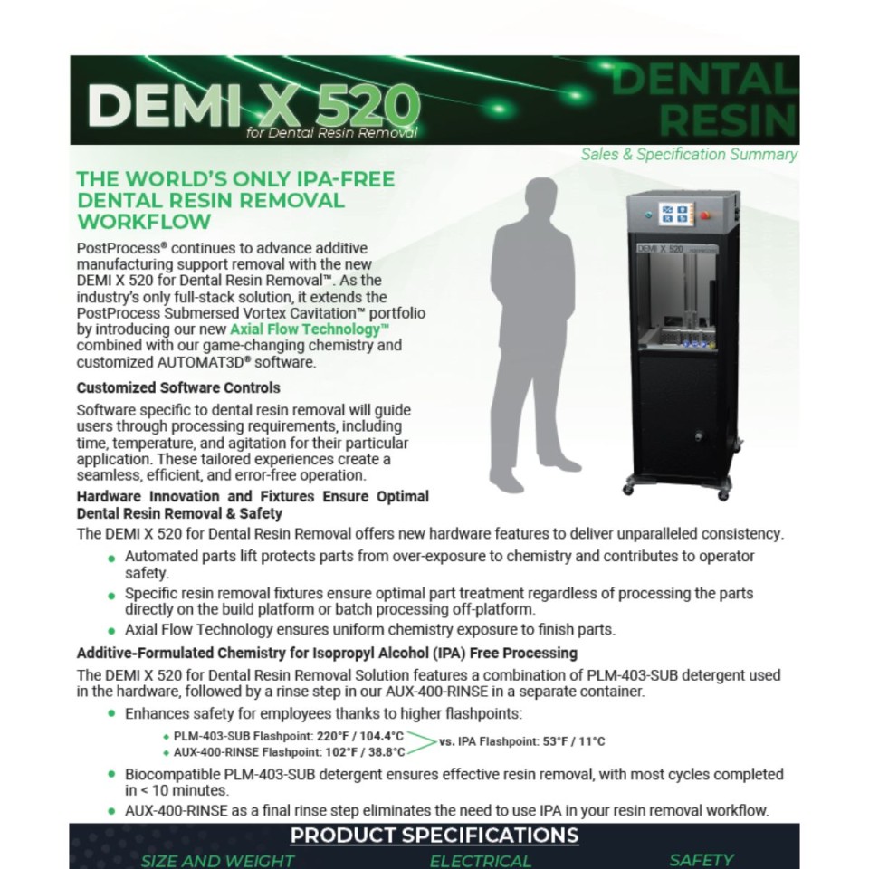 Anfang des Jahres präsentierte PostProcess® den DEMI X 520 für die Entfernung von Dentalresinen vor und treibt damit die Entfernung von überschüssigem Resin in der Additiven Fertigung weiter voran. Diese Komplettlösung erweitert das PostProcess SVC-Portfolio (Submersed Vortex Cavitation™) mit der neuartigen Axial Flow Technology™, innovativer Chemie und kundenspezifischer AUTOMAT3D®-Software, die den Anwender, spezifisch für ihren Anwendungsfall, durch die Verarbeitungsanforderungen wie Zeit, Temperatur und Rührung führt.