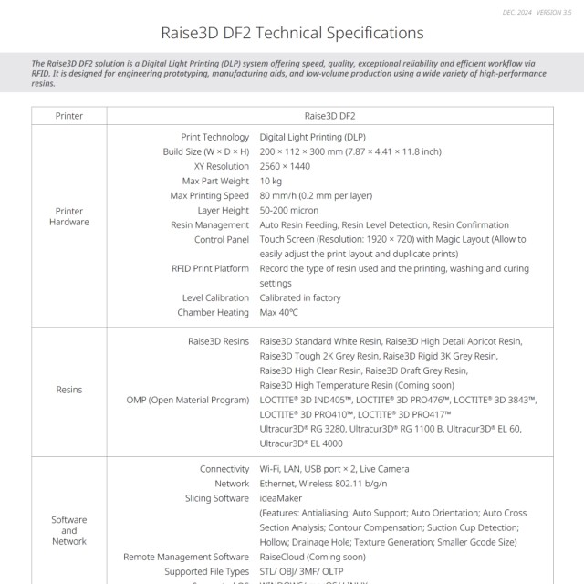 Die hohe Druckqualität wird durch die Verwendung hochwertiger Teile wie dem optischen Glas von Schott Germany, dem DMD-Chip von Texas Instruments in Industriequalität und dem hochtransparenten nFEP-Film gewährleistet. Der Drucker verfügt über eine robuste Z-Achsen-Struktur, die eine statische Last von bis zu 200 kg tragen kann. Benutzer können den Druckvorgang aus der Ferne starten, Protokolle exportieren und ihre Drucker im Auge behalten, indem sie den DF2 in RaiseCloud 1.0 integrieren. Darüber hinaus nutzt der DF2 die Slicing-Software ideaMaker, die über Funktionen wie Hohl- und Drainagefunktionen, automatische Querschnittsanalyse, automatische Generierung von Supportstrukturen, automatische Ausrichtung, Konturkompensation und Antialiasing verfügt.