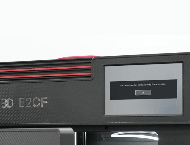 Der Raise3D E2CF verfügt über einen Filament-Run-Out-Sensor, der warnt, wenn das Filament fast leer ist, und den Druckvorgang speichert.