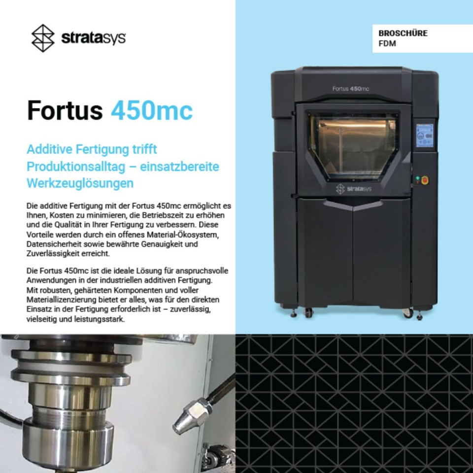 Durch die Kombination fortschrittlicher FDM-Technologie, eines großen Bauraums und erweiterter Materialkompatibilität ist der Stratasys® Fortus 450mc Gen3 für vielseitige Anwendungen in der Luft- und Raumfahrt, der Automobilindustrie sowie dem allgemeinen Maschinen- und Anlagenbau optimiert.