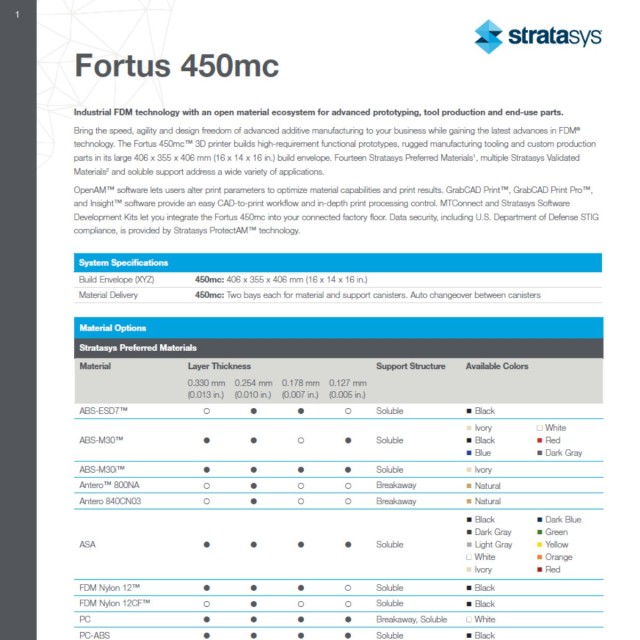 Über 23 von SSYS bevorzugte und/oder validierte Materialien und eine Reihe offener Materialien können auf dem Fortus® 450mc gedruckt werden. Bedrucken Sie Materialien wie Standardkunststoffe, technische Kunststoffe (z. B. nachhaltige, ESD-, lebensmittelverträgliche oder medizinische Materialien), verstärkte Kunststoffe und Spezialkunststoffe (z. B. Verbundwerkstoffe, feuerfest, verschleißfest, mit EMI-Abschirmung) und Hochleistungskunststoffe (Hochtemperatur-FST). Trägermaterialien sind in abbrechbaren und löslichen Formaten erhältlich.