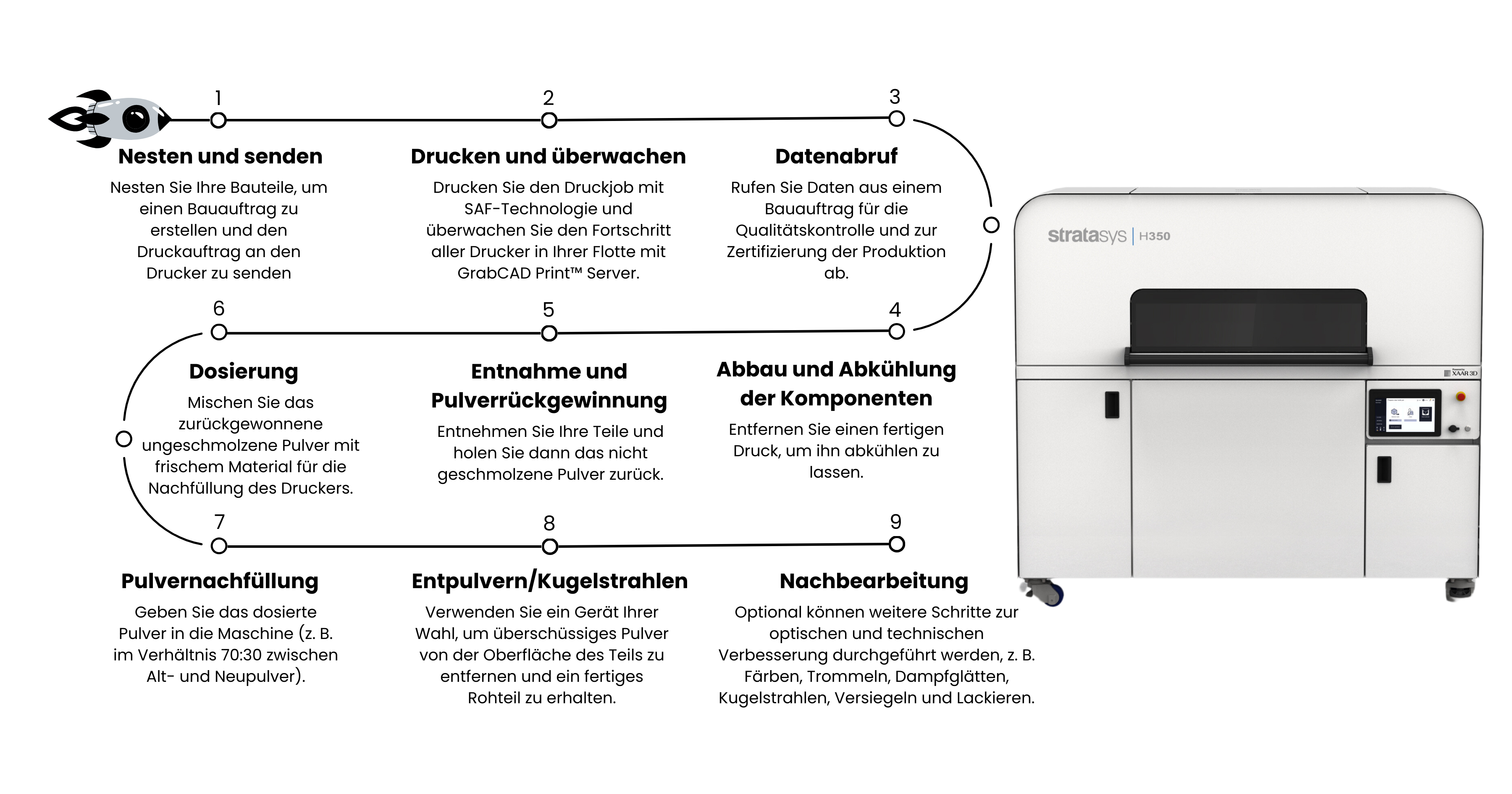 Der H350™-Drucker ist mit seinen langlebigen Industriedruckköpfen, dem geringen Wartungsaufwand, der geringen Anzahl von Verbrauchsmaterialien und den sehr geringen Betriebskosten auf Langlebigkeit ausgelegt. Hinzu kommt, dass ungeschmolzenes Pulver wiederverwendet werden kann - das hält die Materialkosten niedrig und reduziert die Kosten pro Teil.