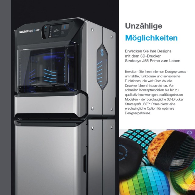 Der J55™ Prime baut auf dem außergewöhnlichen visuellen Vollfarbmodellierungsangebot des J55 auf, indem er zusätzlich zu den Vollfarb-Pantone®-Validierungsfunktionen modernste Druckmöglichkeiten mit taktilen, funktionalen und sensorischen Materialien wie VeroUltra™, High Impact (D-ABS), UltraClearS (glasähnlich) und gummiähnlicher Shore-Härte (Elastico) bietet.