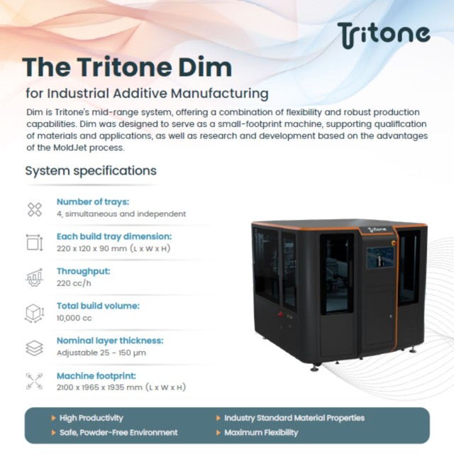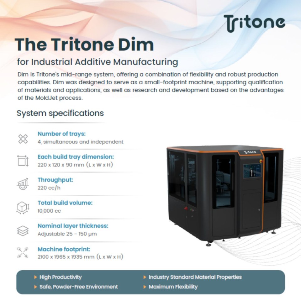 Das Tritone Dim System bietet eine mittelklassige industrielle Lösung, die kompaktes Design mit robuster Produktionsfähigkeit vereint. Es nutzt die einzigartige MoldJet®-Technologie von Tritone, die pulverfrei arbeitet, und liefert hohe Präzision sowie Wiederholbarkeit für die additive Fertigung von Metall- und Keramikteilen. Ideal geeignet für Forschung und Entwicklung, Materialqualifikation sowie Klein- und Mittelserienfertigung.