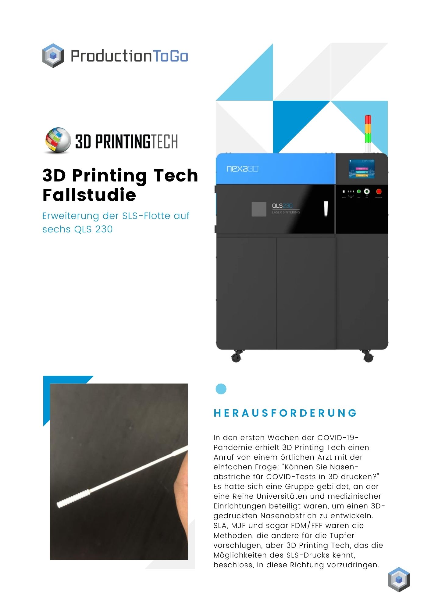In den ersten Wochen der COVID-19-Pandemie erhielt 3D Printing Tech einen Anruf von einem örtlichen Arzt mit der einfachen Frage: "Können Sie Nasen-abstriche für COVID-Tests in 3D drucken?" Es hatte sich eine Gruppe gebildet, an der eine Reihe Universitäten und medizinischer Einrichtungen beteiligt waren, um einen 3D-gedruckten Nasenabstrich zu entwickeln. SLA, MJF und sogar FDM/FFF waren die Methoden, die andere für die Tupfer vorschlugen, aber 3D Printing Tech, das die Möglichkeiten des SLS-Drucks kennt, beschloss, in diese Richtung vorzudringen.