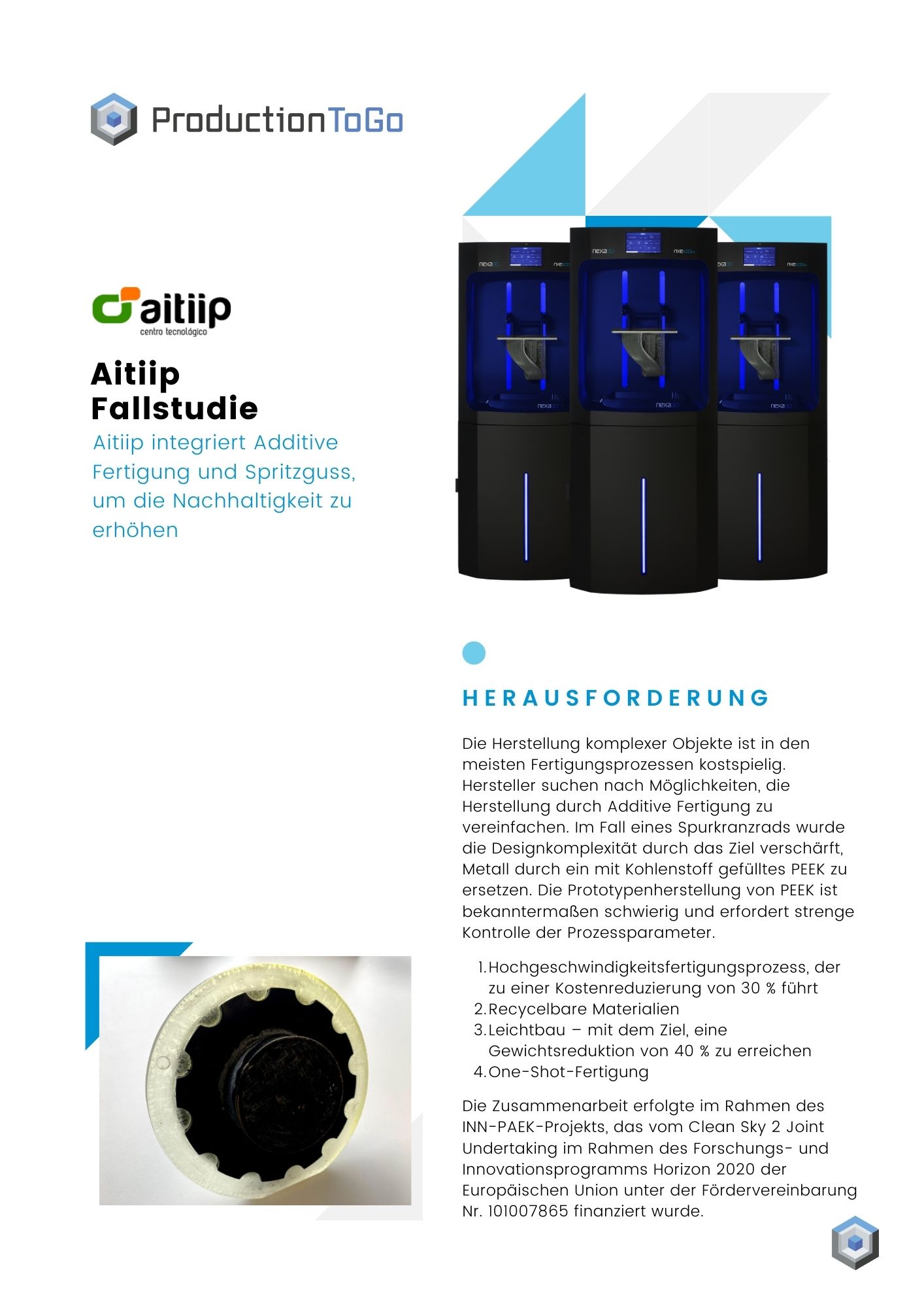 Die Herstellung komplexer Objekte ist in den meisten Fertigungsprozessen kostspielig. Hersteller suchen nach Möglichkeiten, die Herstellung durch Additive Fertigung zu vereinfachen. Im Fall eines Spurkranzrads wurde die Designkomplexität durch das Ziel verschärft, Metall durch ein mit Kohlenstoff gefülltes PEEK zu ersetzen. Die Prototypenherstellung von PEEK ist bekanntermaßen schwierig und erfordert strenge Kontrolle der Prozessparameter. - Hochgeschwindigkeitsfertigungsprozess, der zu einer Kostenreduzierung von 30 % führt - Recycelbare Materialien - Leichtbau – mit dem Ziel, eine Gewichtsreduktion von 40 % zu erreichen - One-Shot-Fertigung