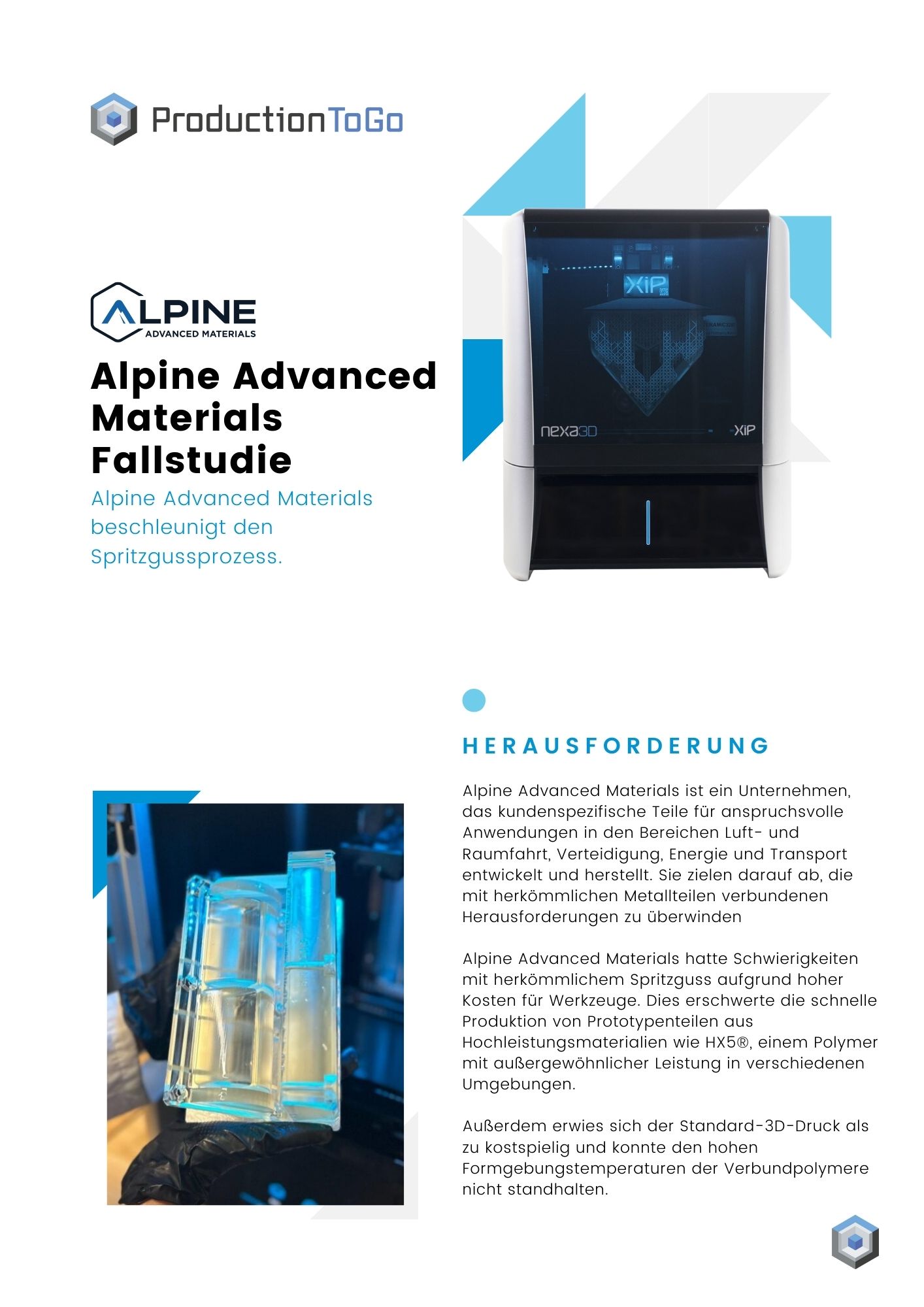 Alpine Advanced Materials ist ein Unternehmen, das kundenspezifische Teile für anspruchsvolle Anwendungen in den Bereichen Luft- und Raumfahrt, Verteidigung, Energie und Transport entwickelt und herstellt. Sie zielen darauf ab, die mit herkömmlichen Metallteilen verbundenen Herausforderungen zu überwinden Alpine Advanced Materials hatte Schwierigkeiten mit herkömmlichem Spritzguss aufgrund hoher Kosten für Werkzeuge. Dies erschwerte die schnelle Produktion von Prototypenteilen aus Hochleistungsmaterialien wie HX5®, einem Polymer mit außergewöhnlicher Leistung in verschiedenen Umgebungen. Außerdem erwies sich der Standard-3D-Druck als zu kostspielig und konnte den hohen Formgebungstemperaturen der Verbundpolymere nicht standhalten.