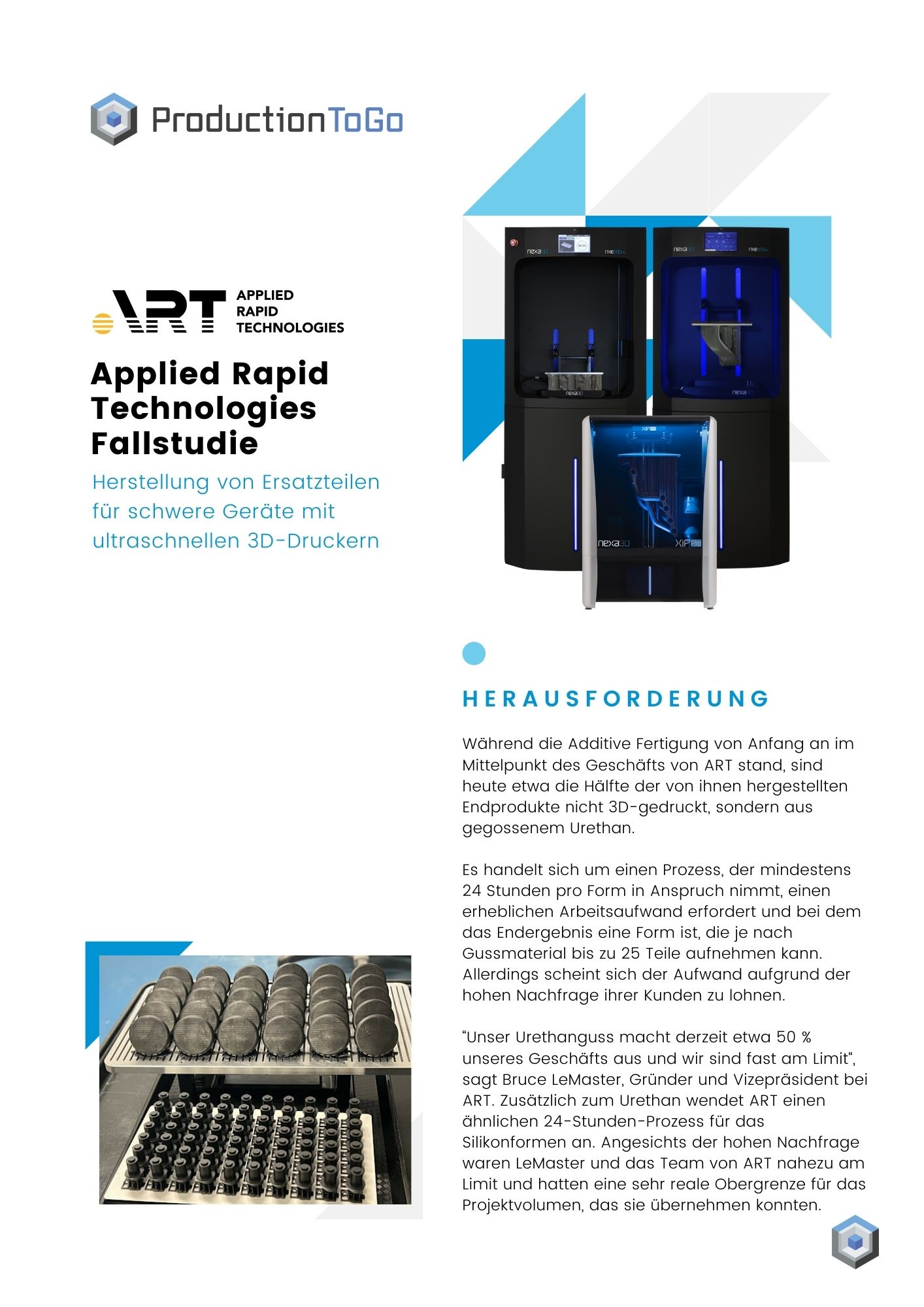 Während die Additive Fertigung von Anfang an im Mittelpunkt des Geschäfts von ART stand, sind heute etwa die Hälfte der von ihnen hergestellten Endprodukte nicht 3D-gedruckt, sondern aus gegossenem Urethan. Es handelt sich um einen Prozess, der mindestens 24 Stunden pro Form in Anspruch nimmt, einen erheblichen Arbeitsaufwand erfordert und bei dem das Endergebnis eine Form ist, die je nach Gussmaterial bis zu 25 Teile aufnehmen kann. Allerdings scheint sich der Aufwand aufgrund der hohen Nachfrage ihrer Kunden zu lohnen. “Unser Urethanguss macht derzeit etwa 50 % unseres Geschäfts aus und wir sind fast am Limit“, sagt Bruce LeMaster, Gründer und Vizepräsident bei ART. Zusätzlich zum Urethan wendet ART einen ähnlichen 24-Stunden-Prozess für das Silikonformen an. Angesichts der hohen Nachfrage waren LeMaster und das Team von ART nahezu am Limit und hatten eine sehr reale Obergrenze für das Projektvolumen, das sie übernehmen konnten.