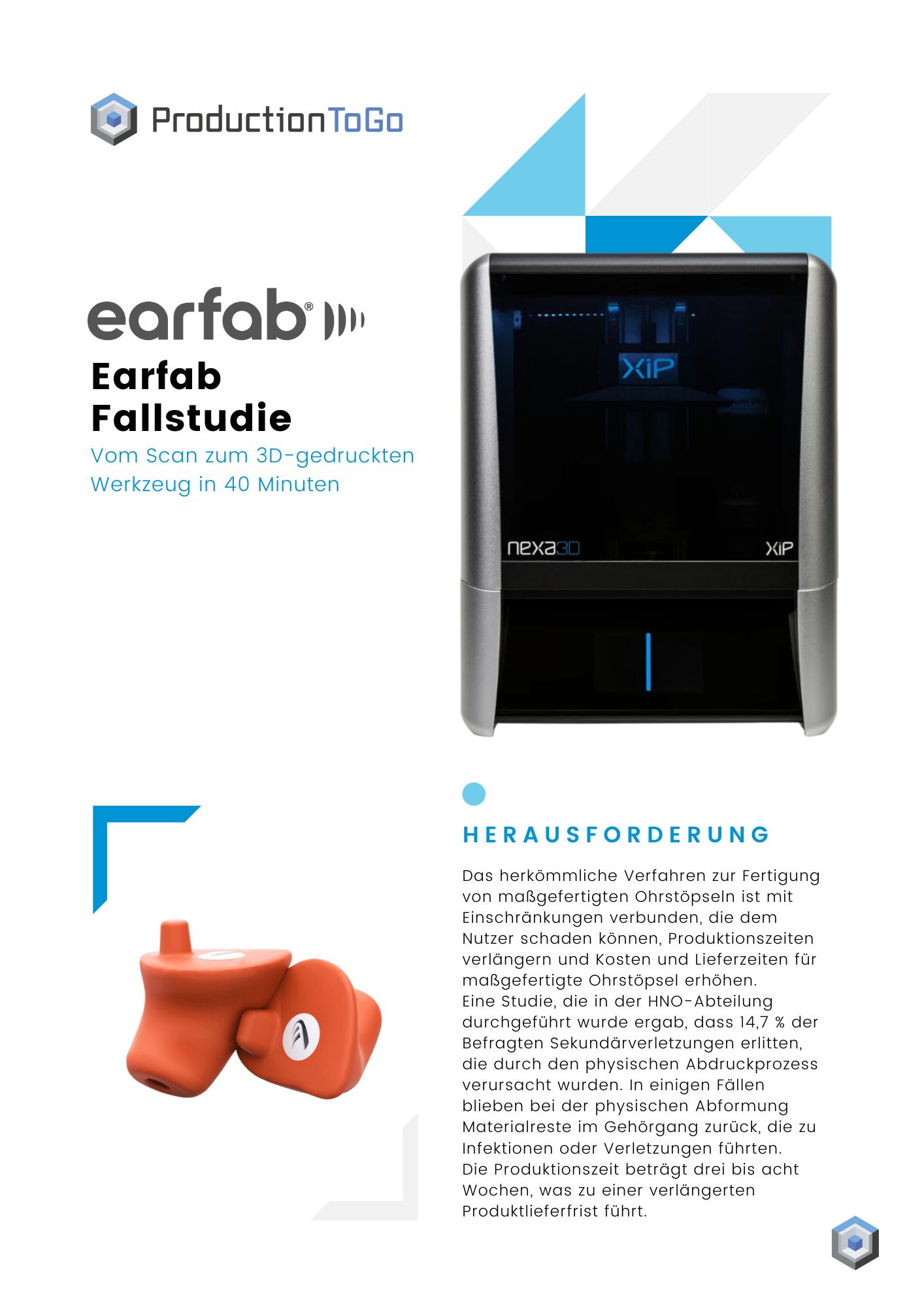 Das herkömmliche Verfahren zur Fertigung von maßgefertigten Ohrstöpseln ist mit Einschränkungen verbunden, die dem Nutzer schaden können, Produktionszeiten verlängern und Kosten und Lieferzeiten für maßgefertigte Ohrstöpsel erhöhen. Eine Studie, die in der HNO-Abteilung durchgeführt wurde ergab, dass 14,7 % der Befragten Sekundärverletzungen erlitten, die durch den physischen Abdruckprozess verursacht wurden. In einigen Fällen blieben bei der physischen Abformung Materialreste im Gehörgang zurück, die zu Infektionen oder Verletzungen führten. Die Produktionszeit beträgt drei bis acht Wochen, was zu einer verlängerten Produktlieferfrist führt.