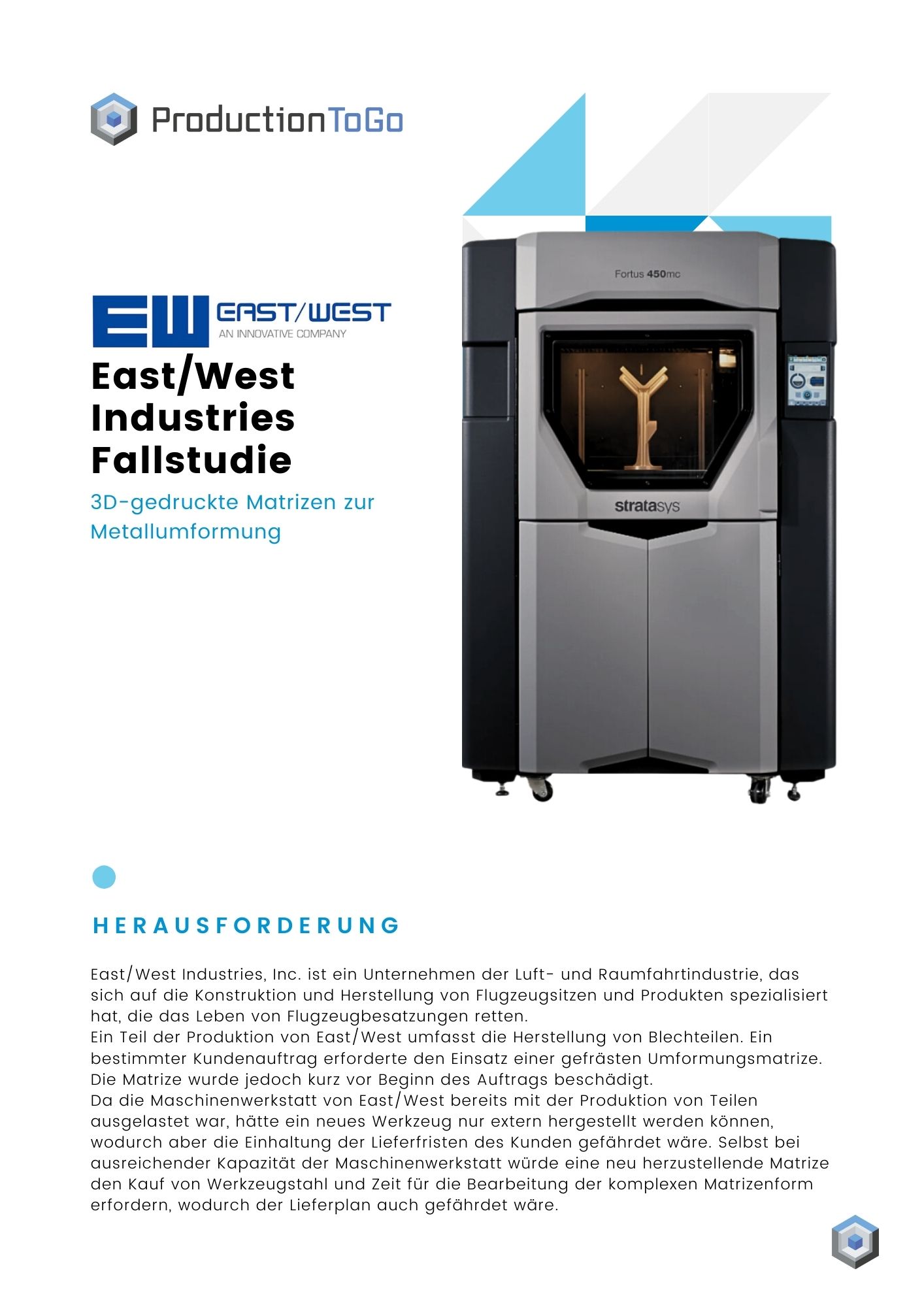 in Teil der Produktion von East/West umfasst die Herstellung von Blechteilen. Ein bestimmter Kundenauftrag erforderte den Einsatz einer gefrästen Umformungsmatrize. Die Matrize wurde jedoch kurz vor Beginn des Auftrags beschädigt. Da die Maschinenwerkstatt von East/West bereits mit der Produktion von Teilen ausgelastet war, hätte ein neues Werkzeug nur extern hergestellt werden können, wodurch aber die Einhaltung der Lieferfristen des Kunden gefährdet wäre. Selbst bei ausreichender Kapazität der Maschinenwerkstatt würde eine neu herzustellende Matrize den Kauf von Werkzeugstahl und Zeit für die Bearbeitung der komplexen Matrizenform erfordern, wodurch der Lieferplan auch gefährdet wäre.