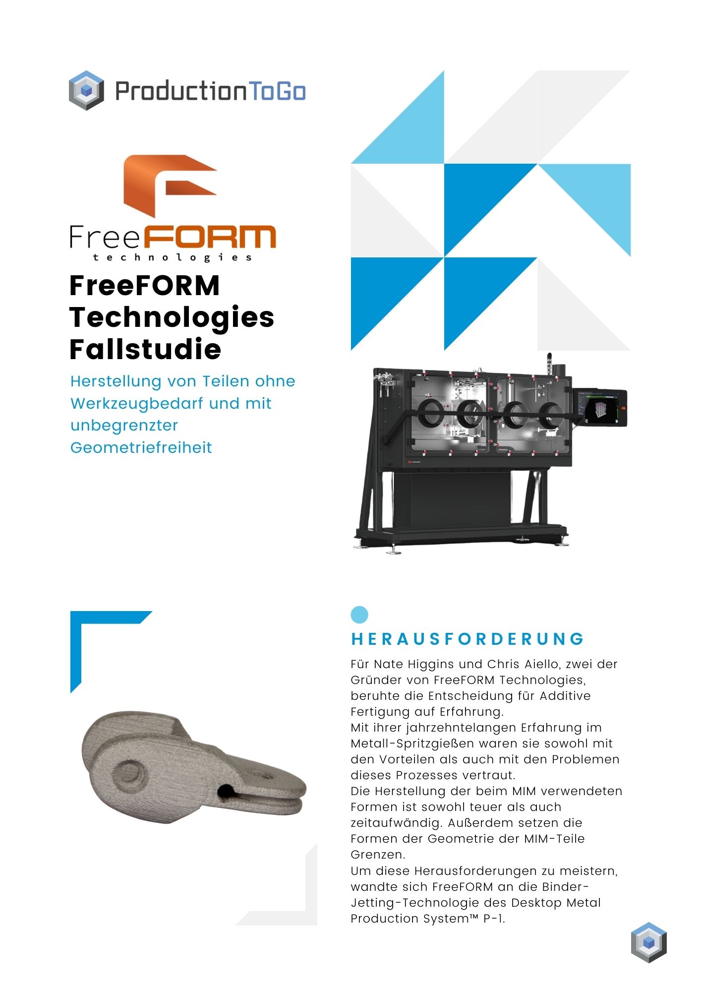Für Nate Higgins und Chris Aiello, zwei der Gründer von FreeFORM Technologies, beruhte die Entscheidung für Additive Fertigung auf Erfahrung. Mit ihrer jahrzehntelangen Erfahrung im Metall-Spritzgießen waren sie sowohl mit den Vorteilen als auch mit den Problemen dieses Prozesses vertraut. Die Herstellung der beim MIM verwendeten Formen ist sowohl teuer als auch zeitaufwändig. Außerdem setzen die Formen der Geometrie der MIM-Teile Grenzen. Um diese Herausforderungen zu meistern, wandte sich FreeFORM an die Binder-Jetting-Technologie des Desktop Metal Production System™ P-1.