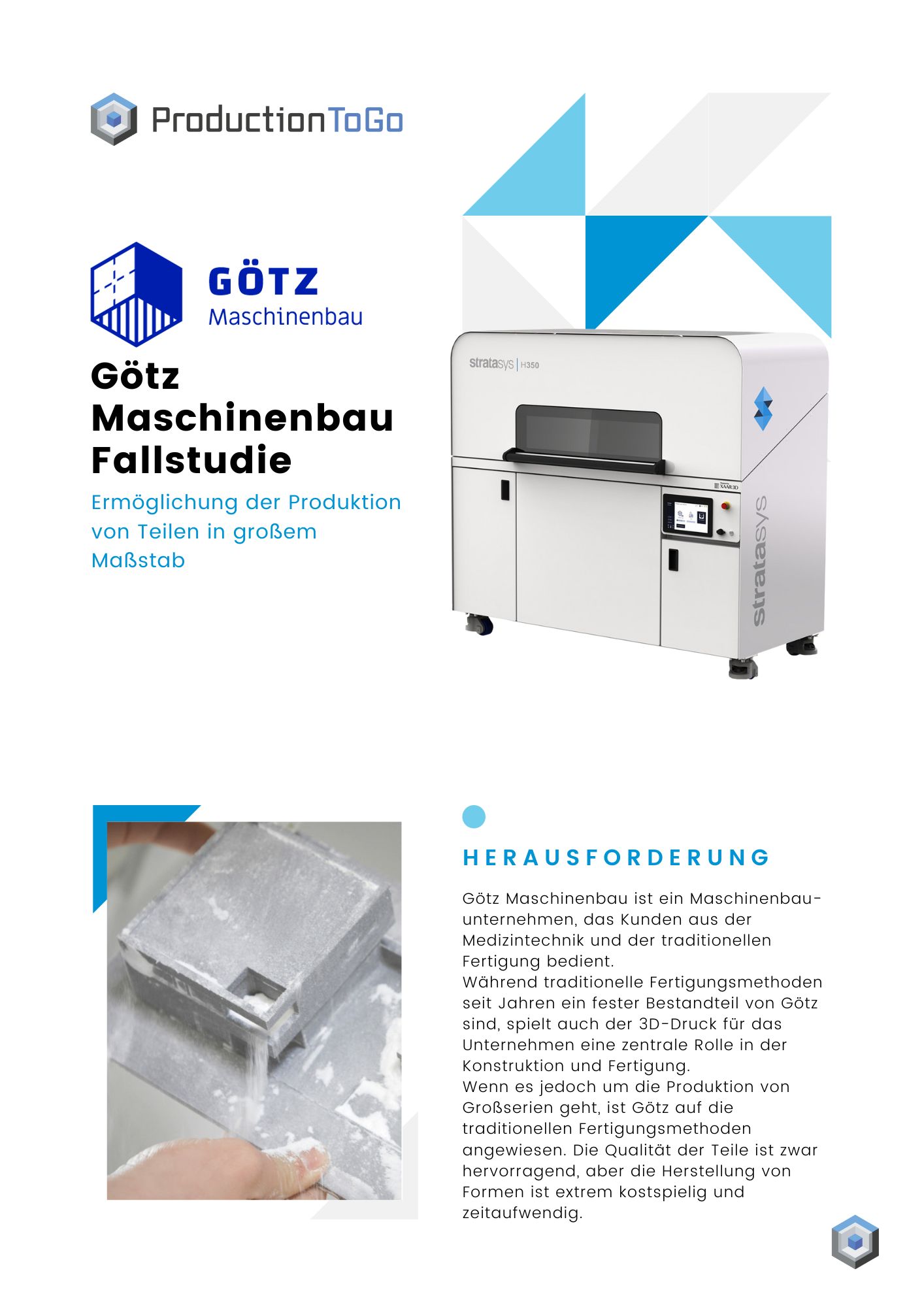 Götz Maschinenbau ist ein Maschinenbauunternehmen, das Kunden aus der Medizintechnik und der traditionellen Fertigung bedient. Während traditionelle Fertigungsmethoden seit Jahren ein fester Bestandteil von Götz sind, spielt auch der 3D-Druck für das Unternehmen eine zentrale Rolle in der Konstruktion und Fertigung. Wenn es jedoch um die Produktion von Großserien geht, ist Götz auf die traditionellen Fertigungsmethoden angewiesen. Die Qualität der Teile ist zwar hervorragend, aber die Herstellung von Formen ist extrem kostspielig und zeitaufwendig.