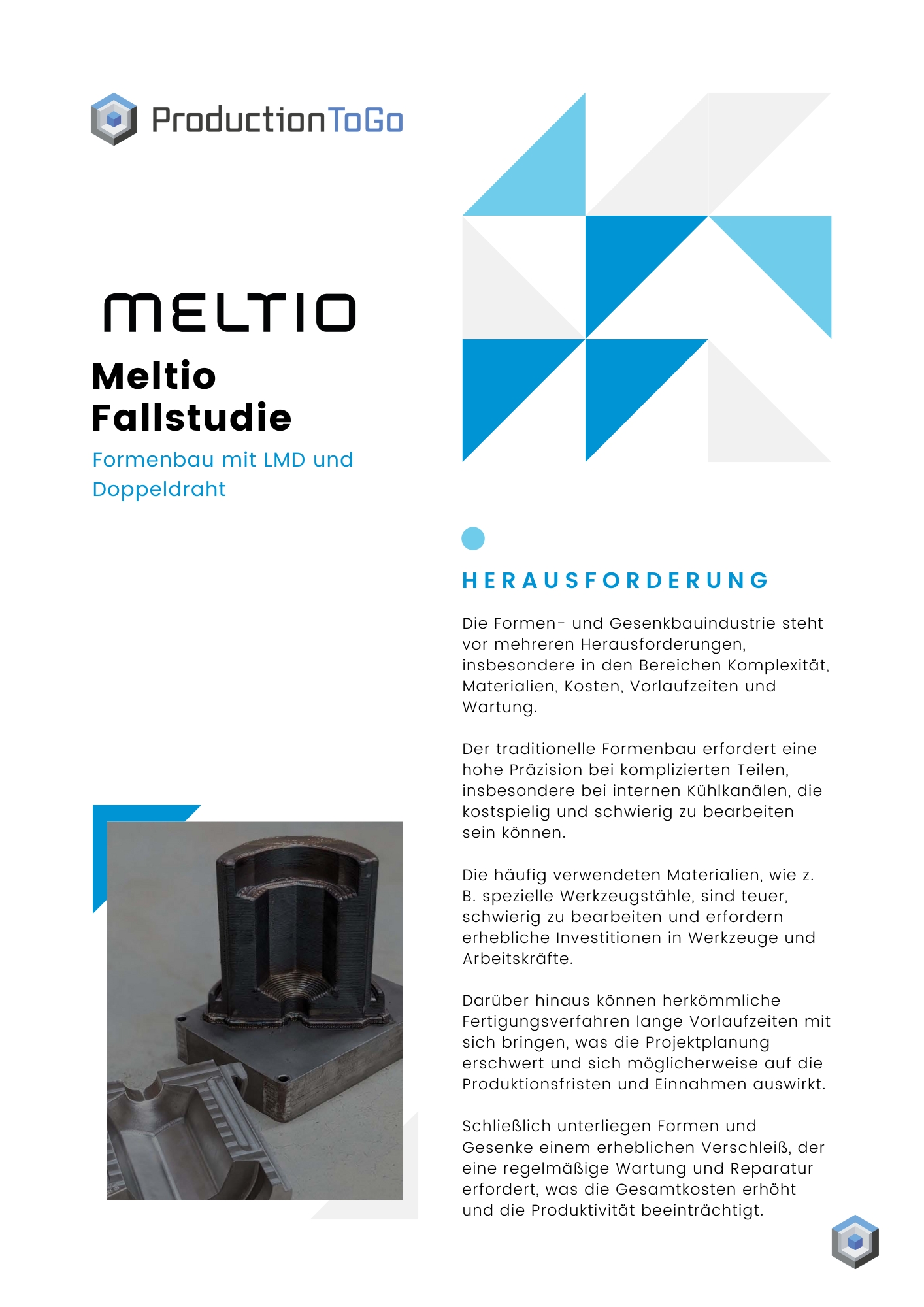 Die Formen- und Gesenkbauindustrie steht vor mehreren Herausforderungen, insbesondere in den Bereichen Komplexität, Materialien, Kosten, Vorlaufzeiten und Wartung. Der traditionelle Formenbau erfordert eine hohe Präzision bei komplizierten Teilen, insbesondere bei internen Kühlkanälen, die kostspielig und schwierig zu bearbeiten sein können. Die häufig verwendeten Materialien, wie z. B. spezielle Werkzeugstähle, sind teuer, schwierig zu bearbeiten und erfordern erhebliche Investitionen in Werkzeuge und Arbeitskräfte. Darüber hinaus können herkömmliche Fertigungsverfahren lange Vorlaufzeiten mit sich bringen, was die Projektplanung erschwert und sich möglicherweise auf die Produktionsfristen und Einnahmen auswirkt. Erfahren Sie in diesem Anwendungsfall, wie die LMD-Technologie von Meltio diese Probleme löst und für mehr Effizienz sorgt!
