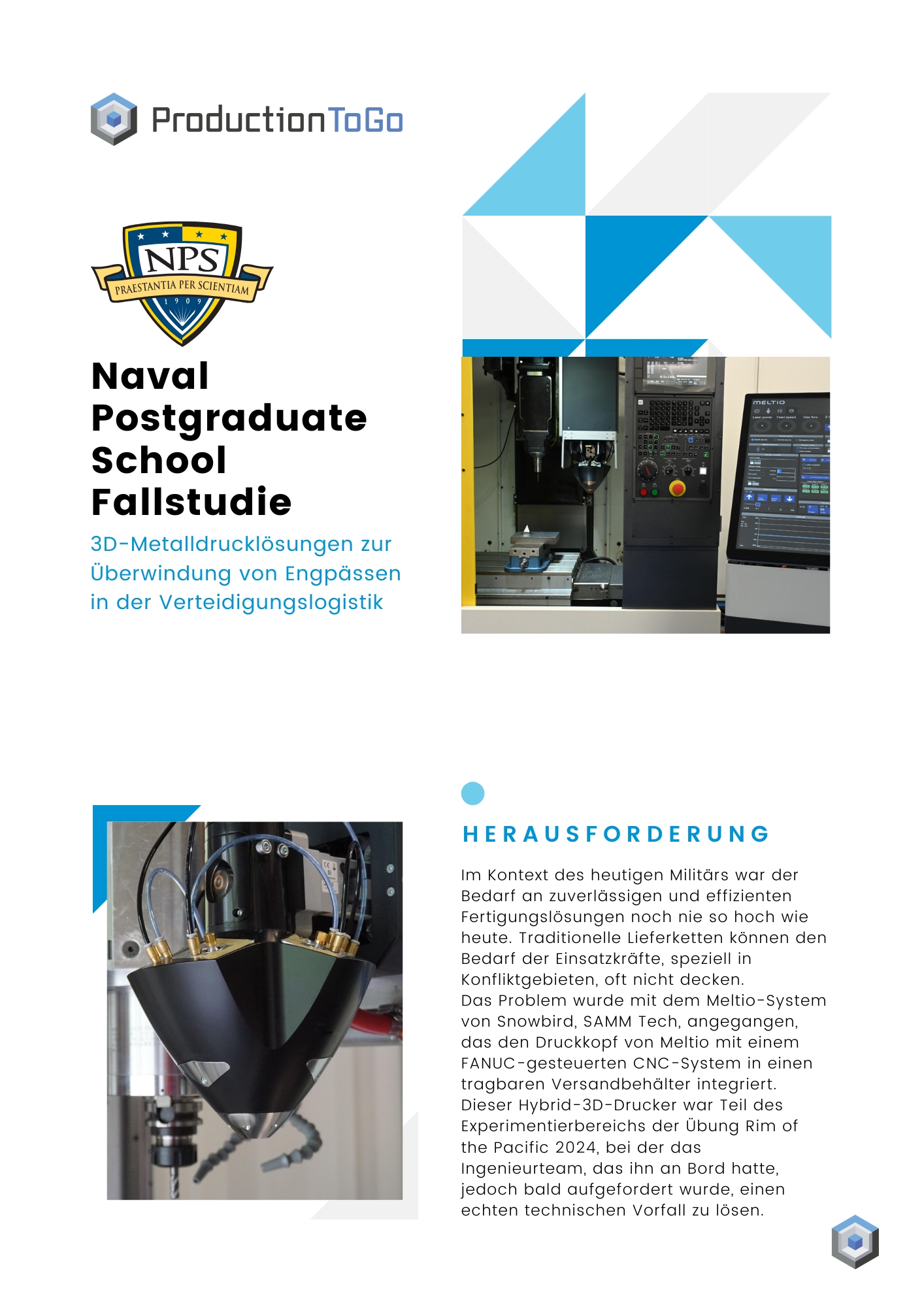 Im Kontext des heutigen Militärs war der Bedarf an zuverlässigen und effizienten Fertigungslösungen noch nie so hoch wie heute. Traditionelle Lieferketten können den Bedarf der Einsatzkräfte, speziell in Konfliktgebieten, oft nicht decken. Das Problem wurde mit dem Meltio-System von Snowbird, SAMM Tech, angegangen, das den Druckkopf von Meltio mit einem FANUC-gesteuerten CNC-System in einen tragbaren Versandbehälter integriert. Dieser Hybrid-3D-Drucker war Teil des Experimentierbereichs der Übung Rim of the Pacific 2024, bei der das Ingenieurteam, das ihn an Bord hatte, jedoch bald aufgefordert wurde, einen echten technischen Vorfall zu lösen. Erfahren Sie in dieser Fallstudie, wie die Meltio-Lösung diesen Vorfall lösen konnte!