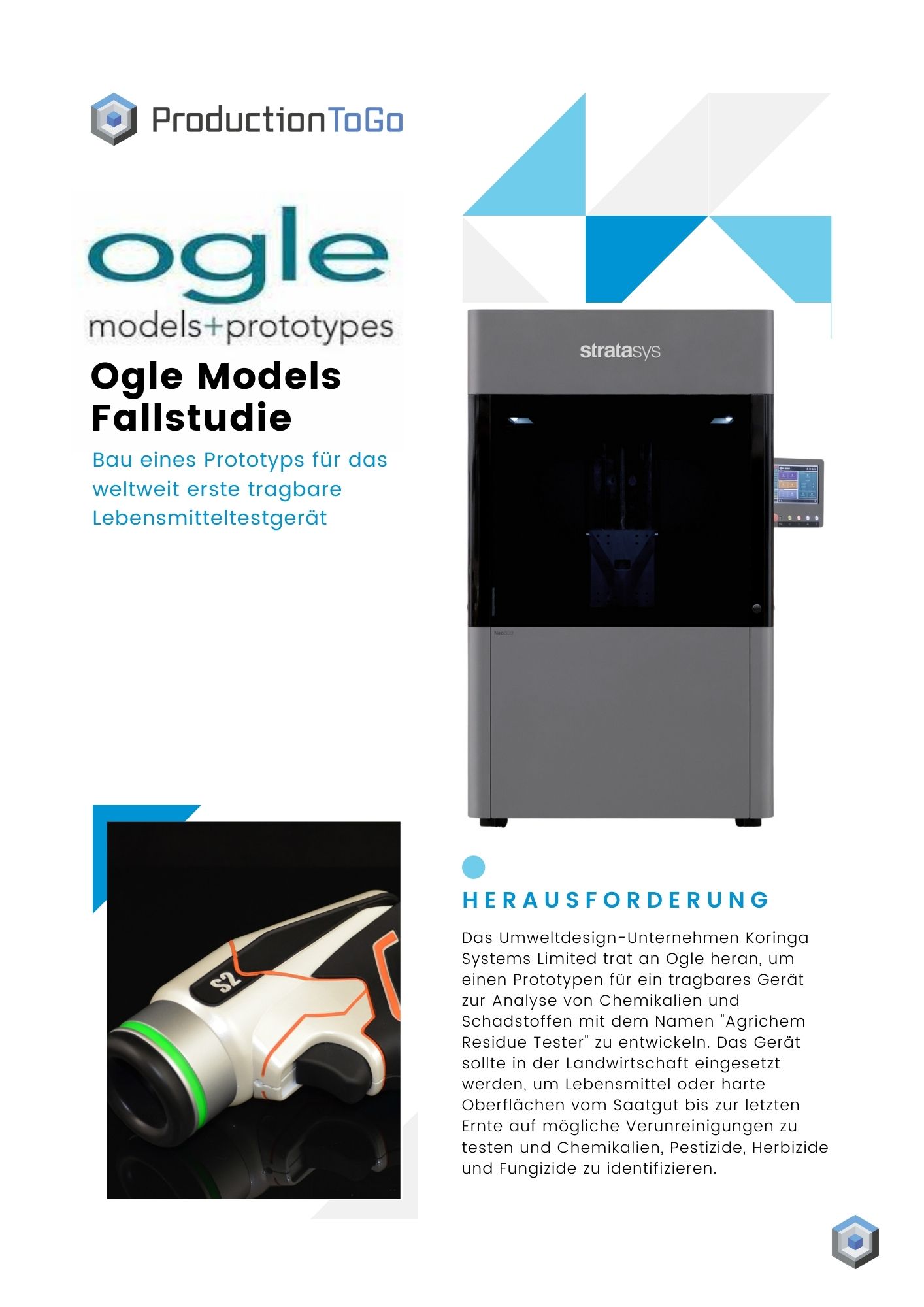 Das Umweltdesign-Unternehmen Koringa Systems Limited trat an Ogle heran, um einen Prototypen für ein tragbares Gerät zur Analyse von Chemikalien und Schadstoffen mit dem Namen "Agrichem Residue Tester" zu entwickeln. Das Gerät sollte in der Landwirtschaft eingesetzt werden, um Lebensmittel oder harte Oberflächen vom Saatgut bis zur letzten Ernte auf mögliche Verunreinigungen zu testen und Chemikalien, Pestizide, Herbizide und Fungizide zu identifizieren.