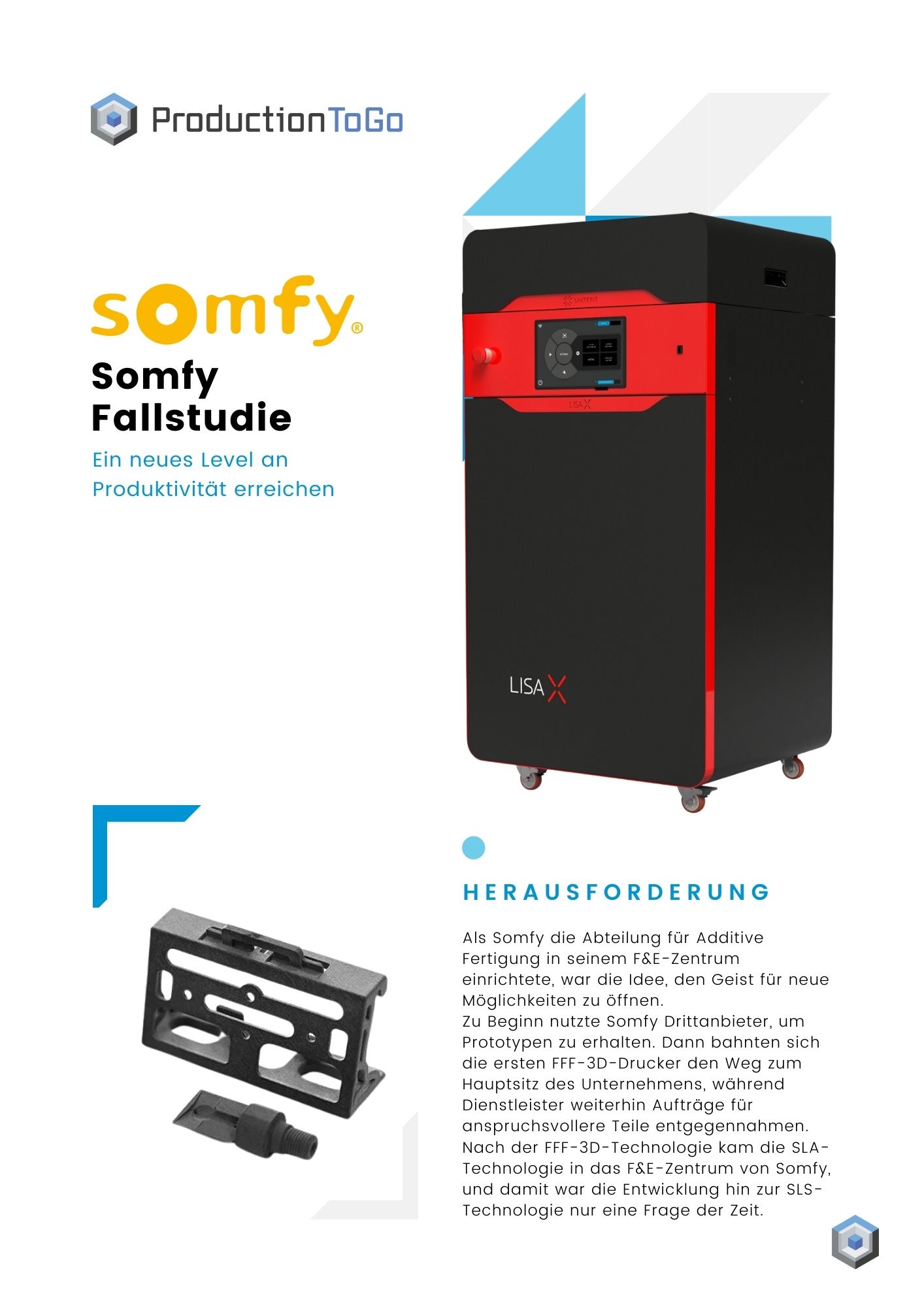 Als Somfy die Abteilung für Additive Fertigung in seinem F&E-Zentrum einrichtete, war die Idee, den Geist für neue Möglichkeiten zu öffnen. Zu Beginn nutzte Somfy Drittanbieter, um Prototypen zu erhalten. Dann bahnten sich die ersten FFF-3D-Drucker den Weg zum Hauptsitz des Unternehmens, während Dienstleister weiterhin Aufträge für anspruchsvollere Teile entgegennahmen. Nach der FFF-3D-Technologie kam die SLA-Technologie in das F&E-Zentrum von Somfy, und damit war die Entwicklung hin zur SLS-Technologie nur eine Frage der Zeit.