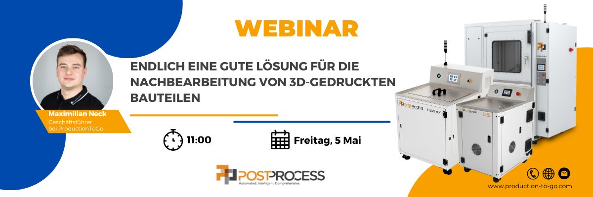 In dieser 20-minütigen Webinaraufzeichnung spricht der Geschäftsführer der ProductionToGo GmbH, Maximilian Neck, über die hochautomatisierten Nachbearbeitungslösungen von PostProcess Technologies®.